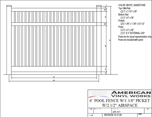 6' Tall x 8' Wide Pool Closed Picket Fence with 2-1/2" Air Space For Vinyl Fences