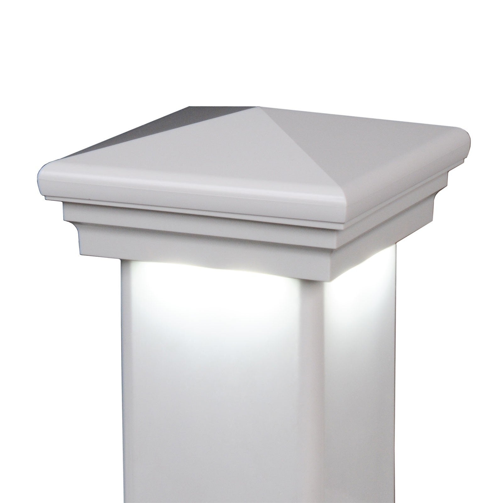 These 5" x 5" Neptune Downward Low Voltage LED Light Post Caps combine functionality, beauty, and convenience into one. Designed for 5" x 5" vinyl fence posts, their pyramid-shaped chassis provide an attractive top adornment, increasing the beauty of your fence and deck posts. But what's especially appealing is the cool white light emitted from the bottom of the cap. When activated, the LED in the cap casts light down all four sides of your fence post. The light is pleasant, providing ambiance and illumination without being overwhelming. So you can achieve quite the display with many feet of fence or deck railing topped with these solar post caps. And the best part is that these caps do not require electrical connection,�so you can forget about the hassles involved with wiring and plug-ins (not to mention ramping up your electric bill). Each 0.8-watt bulb exudes light equal to a 40-watt bulb.
