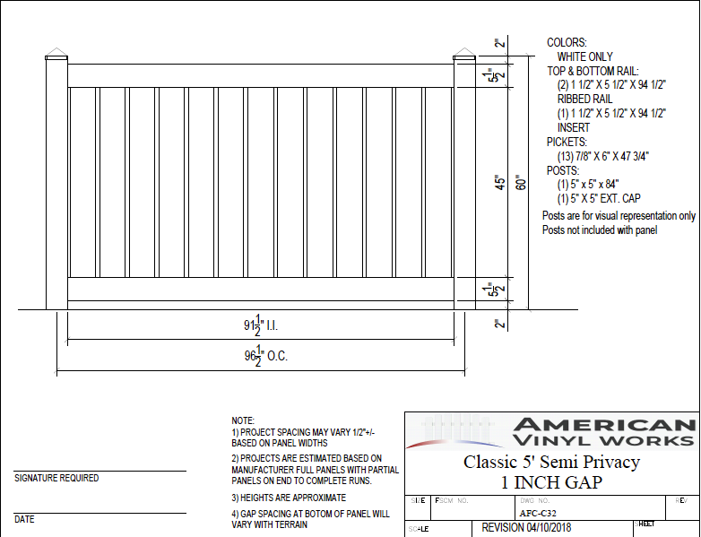 5' Tall x 8' Wide Semi Privacy Vinyl Fence Panel