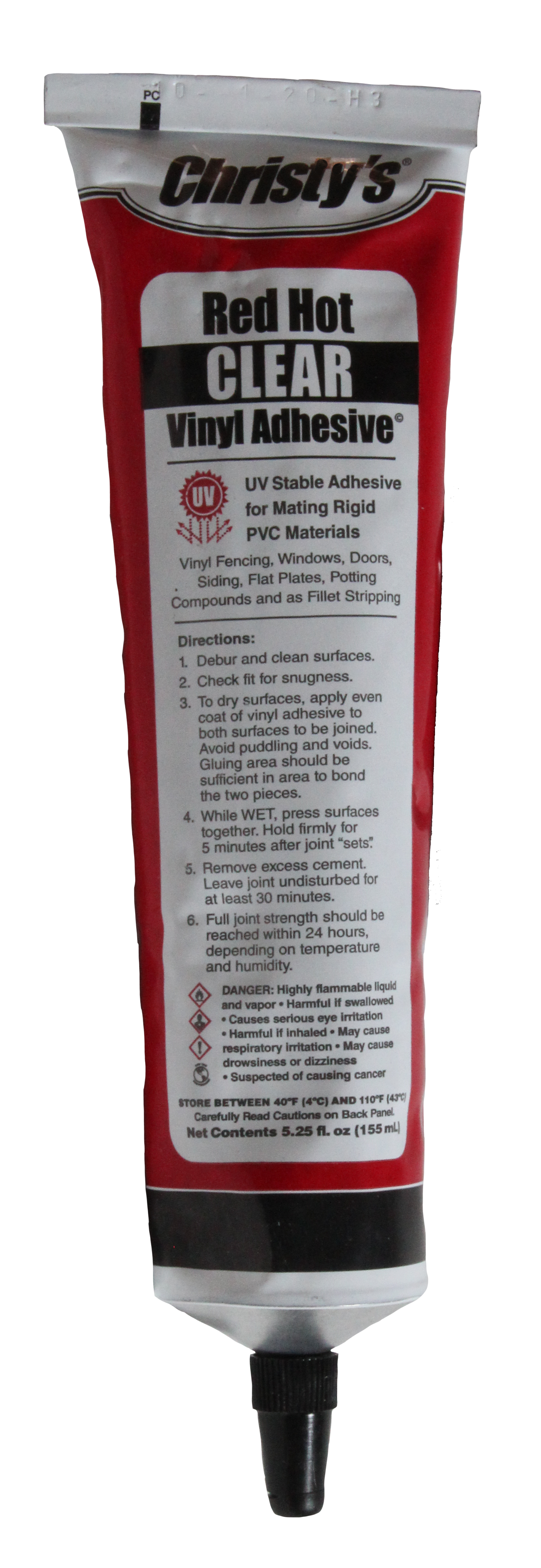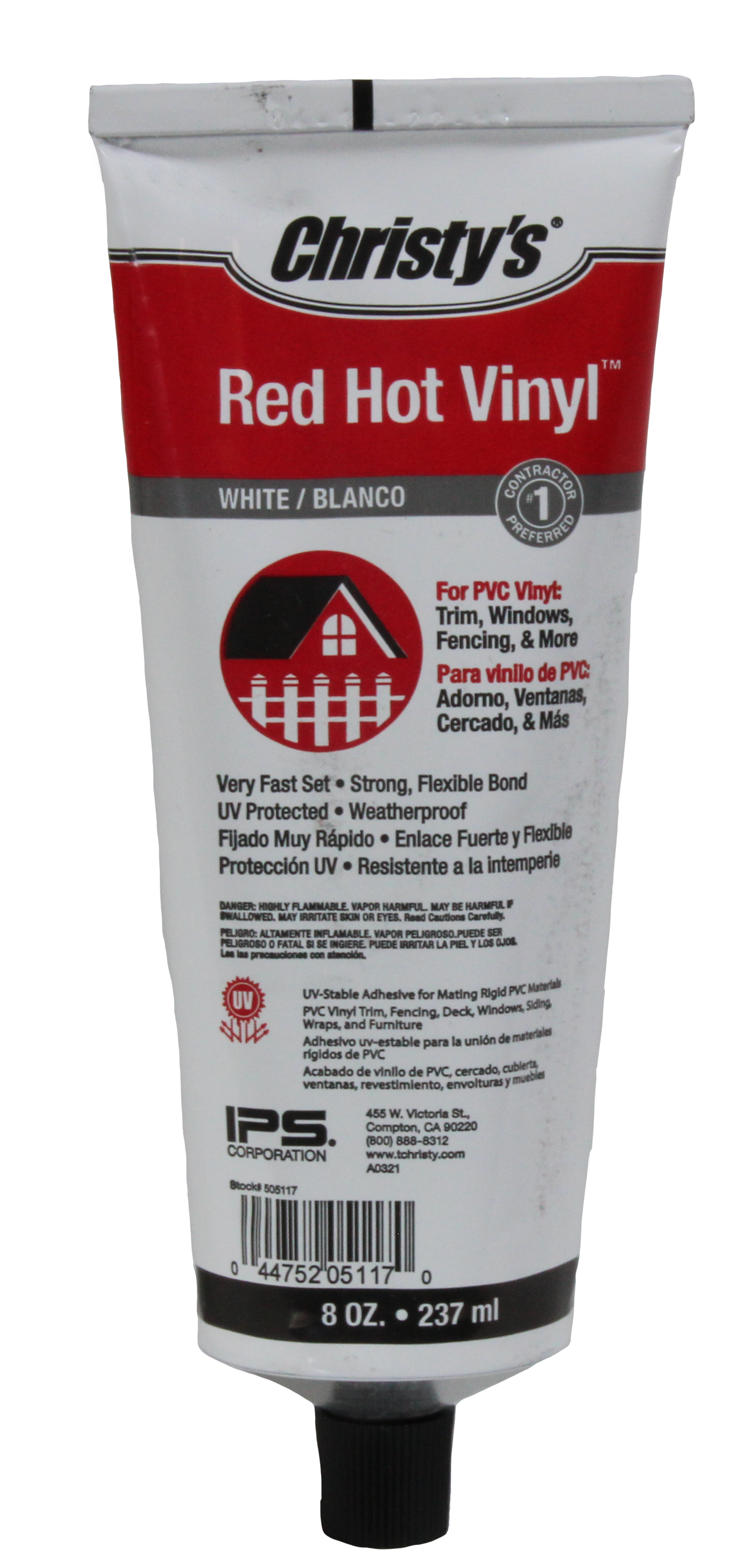 Product Description: When it comes to assembling PVC fences, decks, railings, furniture, etc., professionals recommend Christy's Red Hot Vinyl Glue. A #1 contractor-preferred brand, this adhesive's celebrated for its seamless application and reliable strength. Before applying, clean and dry off the PVC surfaces to be joined. Apply an even coat of adhesive to both parts of the ‚¬œjoint"; for the best results, avoid puddles and voids. With the glue still wet, press the two parts together. Hold firmly in place for five minutes after the joint ‚¬œsets." You can then remove any excess bond and leave the joined parts undisturbed for at least thirty minutes. Within twenty-four hours, the glue should reach its final hardened state,�at which point it'll be weatherproof, resilient to water damage and UV rays. This white glue is perfect for white vinyl fence projects and comes in an 8oz tube, enough for several assembly projects. It is a domestically manufactured product, made in the United States.
