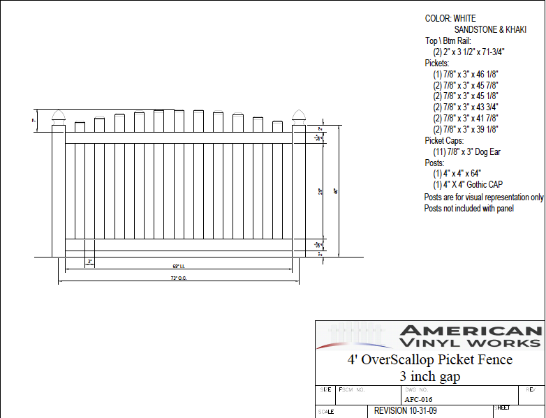 [Price Per Foot - AFC-016] 4' Tall Overscallop Picket Fence with 3" Air Space For Vinyl Fences